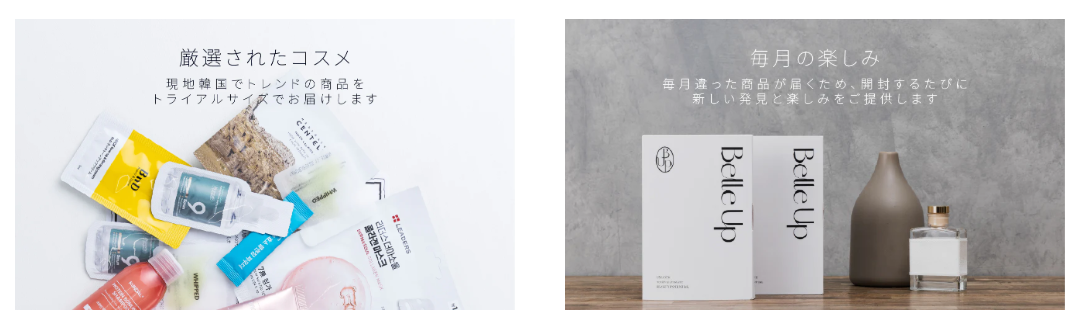 韓国コスメのサンプル月額サービス「Belle Up」は、韓国現地で厳選された人気・話題のアイテムを、送料込・税込で毎月お手頃に試せるサブスク。