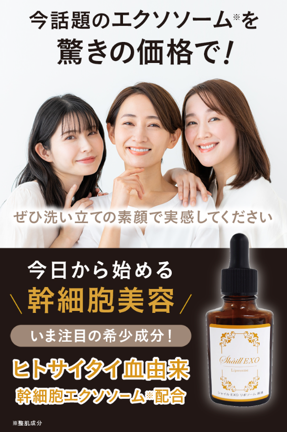 主役はヒトサイタイ由来エクソソーム。研究で注目されている成長因子(EGF)を豊富に含むことが特徴で、肌のターンオーバーを整え再生力を後押しします。さらに保湿やハリをサポートする美容成分をプラスし、総合的なエイジングケアを目指します。