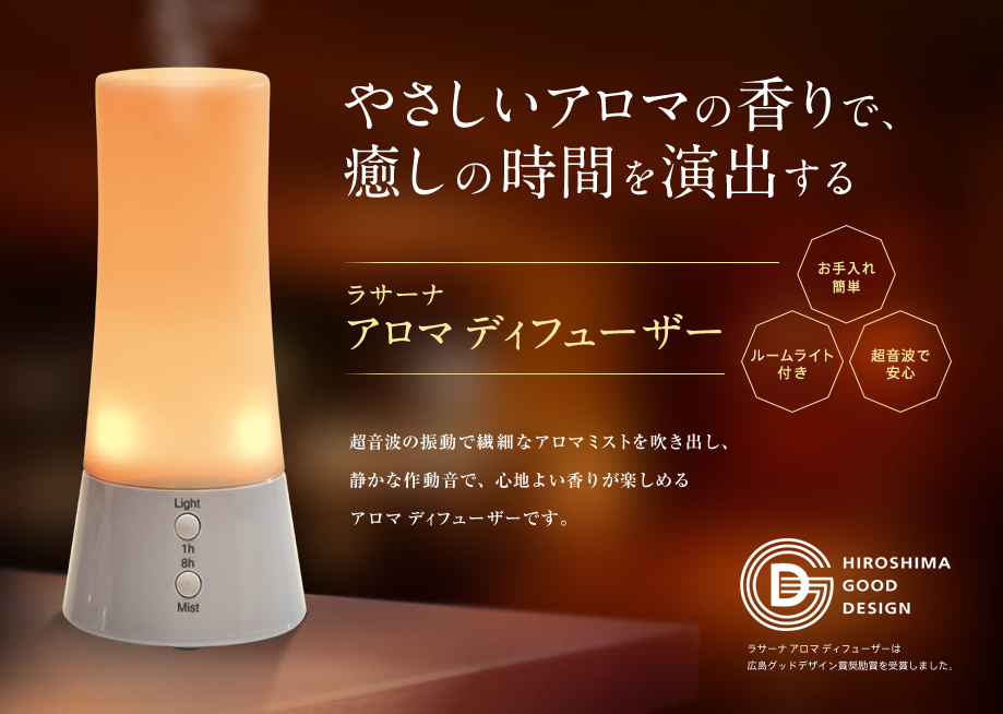 - 超音波式でやさしいミスト。熱を使わないのでオイルの香りが変わりにくい。