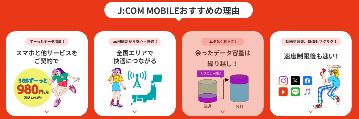 J:COMモバイルは、月額 1,078円(税込)〜 利用できる格安スマホ・格安SIMサービスです。